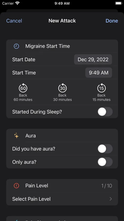 MigraineBot is a modern app with a clean interface, designed to keep attack recording simple: