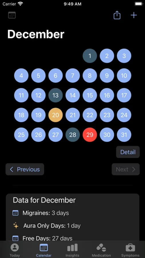 - Integrates with the Health App to show menstruation information. See the relationship between your period and migraine attacks in the calendar.
