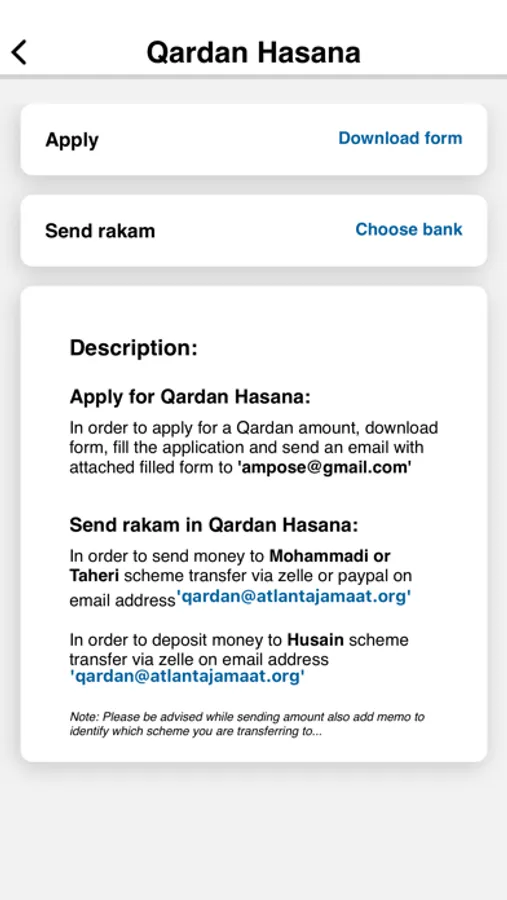 Download the Qardan Hasana form. You can do online transfer to send Qardan amount every Friday or at Miqaats. You can transfer funds through Bank of America, Chase Bank or Wells Fargo Bank.