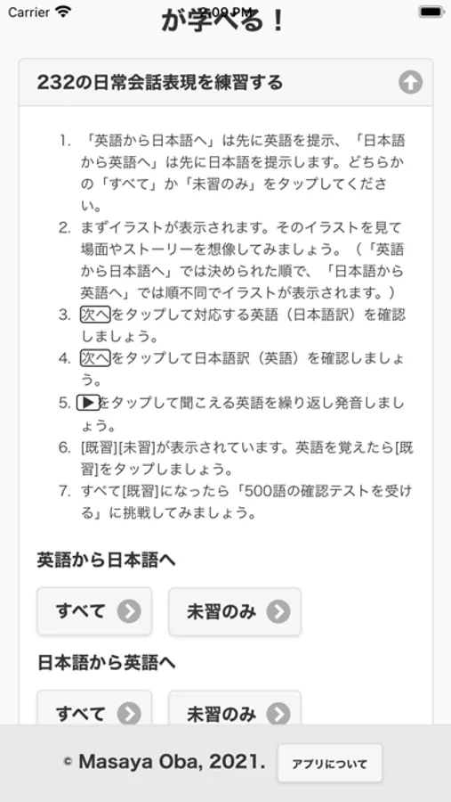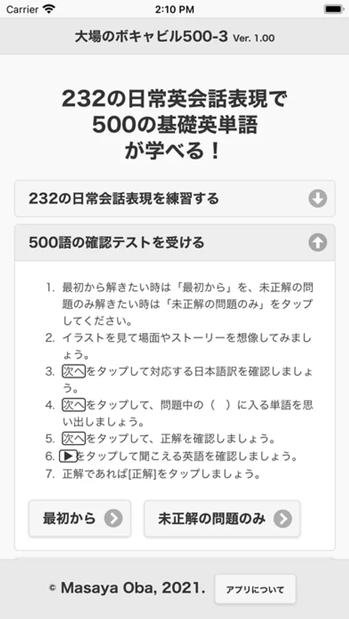 ・「大場のボキャビル500-3」では、大場が選んだ基礎英単語500語を232の例文に盛り込み、イラストと音声をつけました。