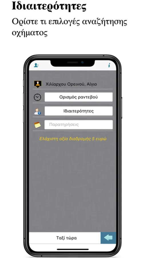 Έχεις την δυνατότητα να αποθηκεύσεις τοποθεσίες, να δεις το ιστορικό σου και να βαθμολογήσεις την διαδικασία εύρεσης ταξί.