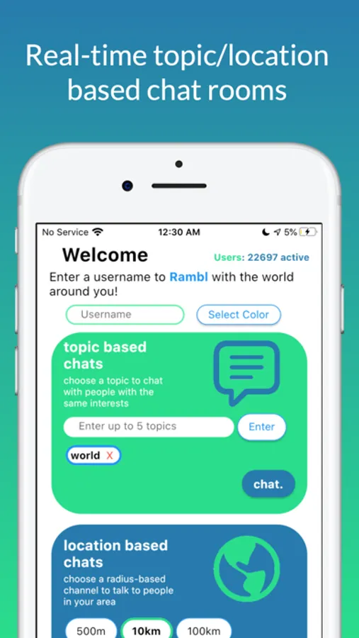 Rambl is a series of chat rooms where you can talk to people within a certain distance from you or to the world about a certain subject. Rambl gives any location or topic a realtime public chatroom!