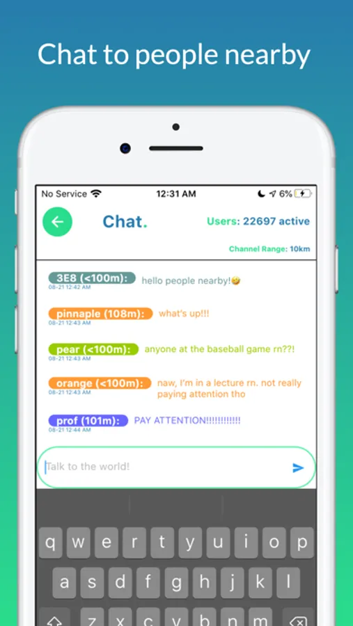 The location based chat lets you talk to anyone within a, 500m, 10km, or 100km radius of you! This feature is perfect for large social gatherings, like sports, concerts, or events. Instead of just talking to people who can hear you, Rambl lets you talk to anyone within your specified radius.