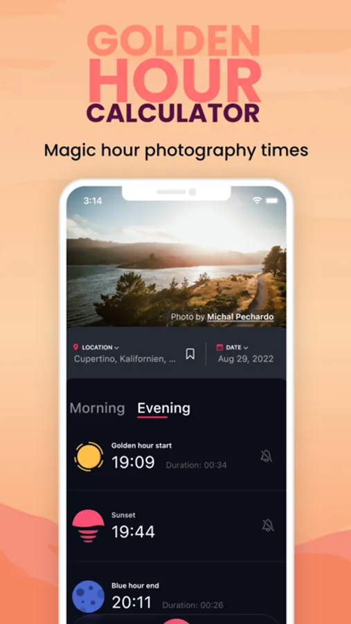 Never miss that perfect light for your photography again. Golden Hour Calculator will be a reliable companion to make sure you hit that amazing golden light.