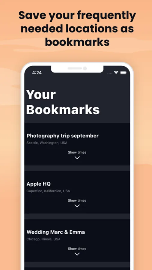 Need to look up magic hour times for a specific place frequently? Simply save it as a bookmark for one-tap access.