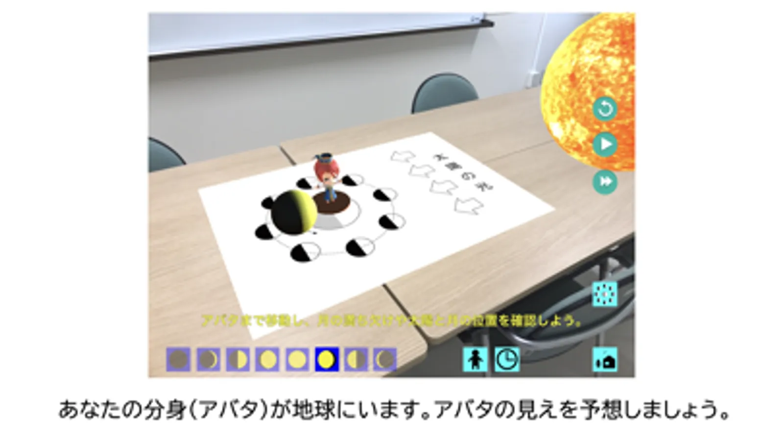 宇宙では,地球やアバタの中に入りこみ,満ち欠けを観察できます。