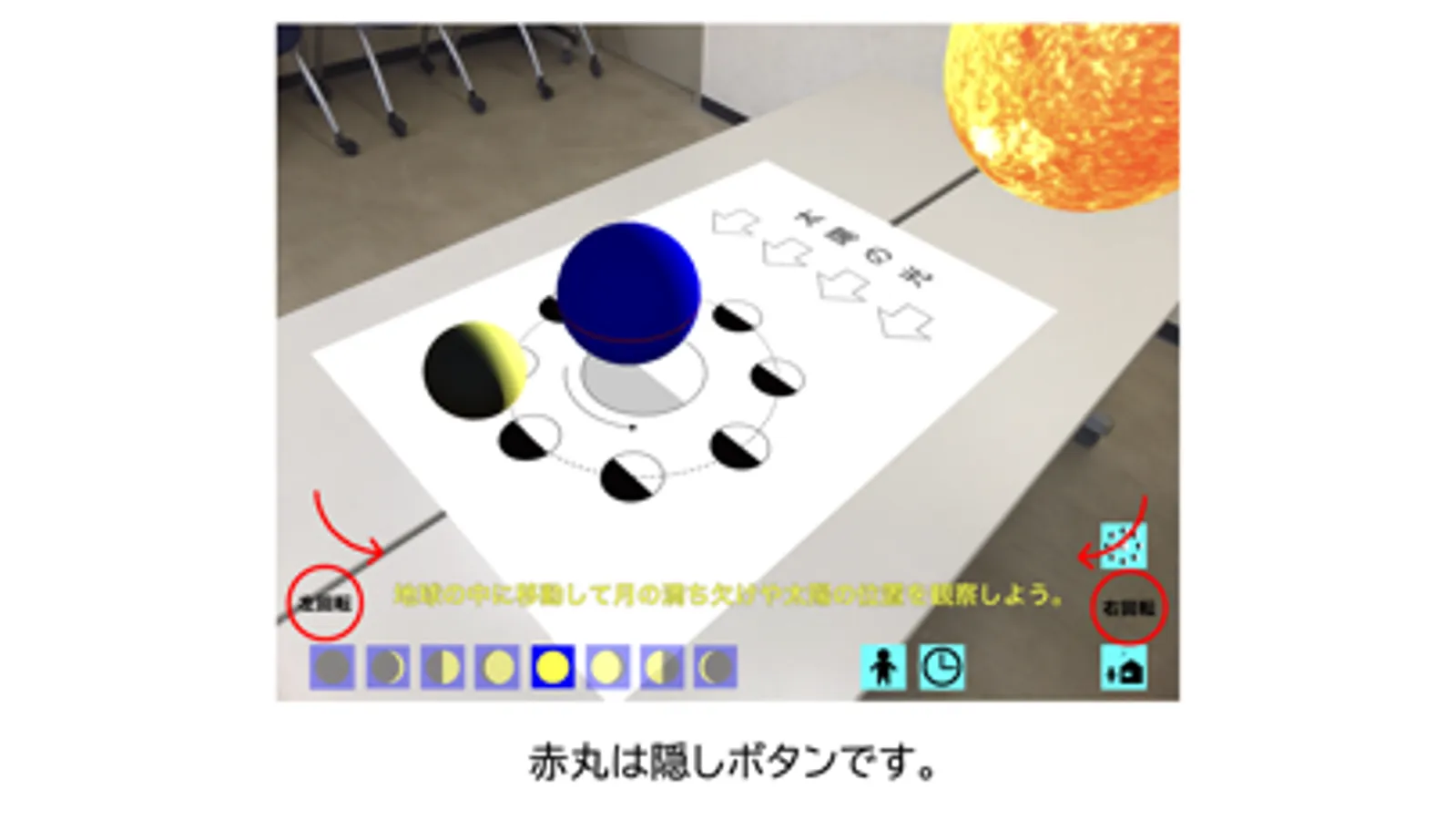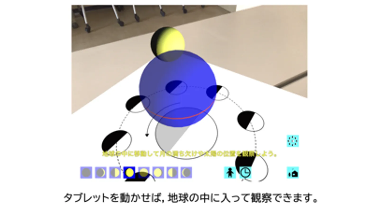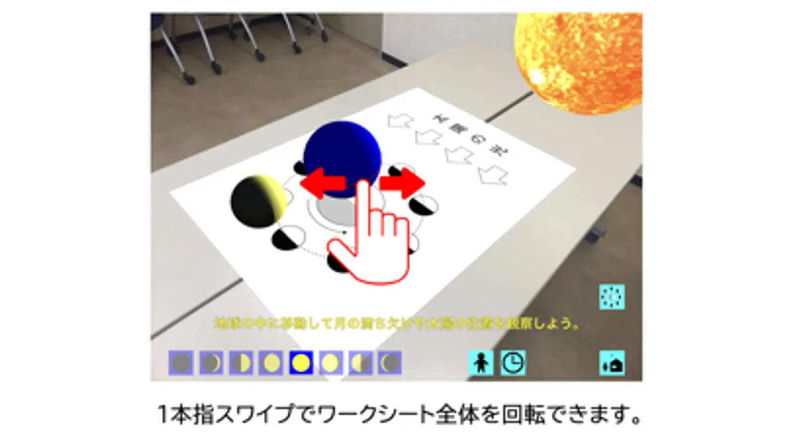 地上から月や太陽の日周運動を観察できます。月が輝く方向に太陽があること,満ち欠けによって月と太陽の位置が変わることを観察できます。また,太陽,月,地球を北極上空から見る平面図(以下,ワークシート)上に立体モデルを拡張現実(AR)で表示させることもできます。これによって,月の形と太陽の位置の関係を考えることができます。