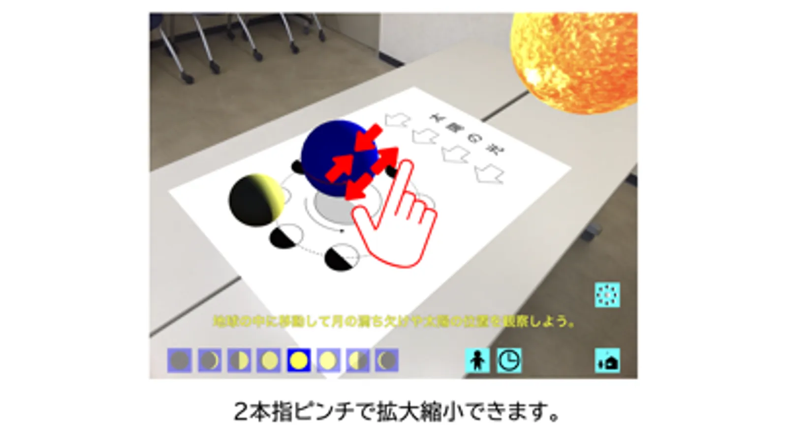 このアプリは,ARマーカーが必要ありません。机などの平面をカメラでスキャンすることで,月・地球・太陽モデルを表示することができます。