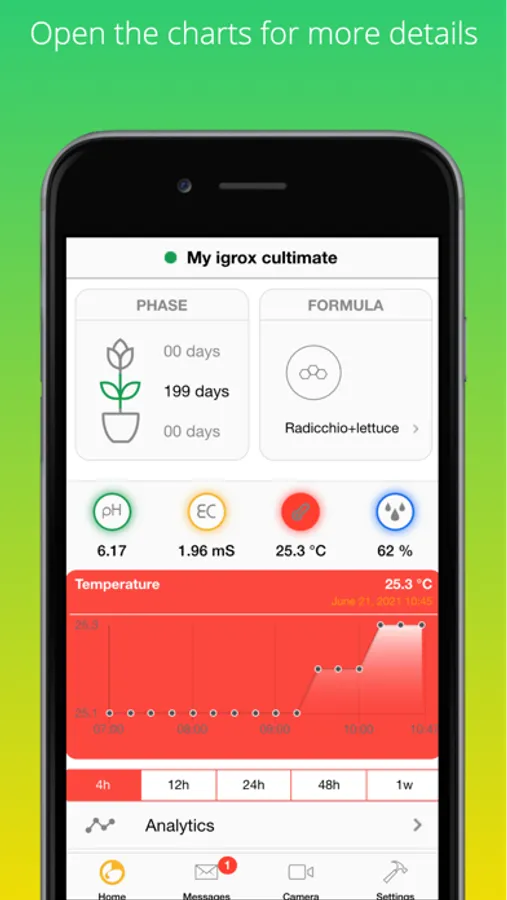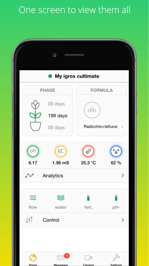 Con CultiMate è possibile controllare tutti i sistemi degli impianti igrox HO.M.E., gestire la soluzione irrigua, programmare intensità, ora di accensione e di spegnimento dei sistemi LED igrox®, controllare i livelli di umidità relativa presenti in ambiente, il funzionamento dei fan o di eventuali estrattori. E' possibile visionare direttamente lo stato della coltivazione scattando delle foto in tempo reale.