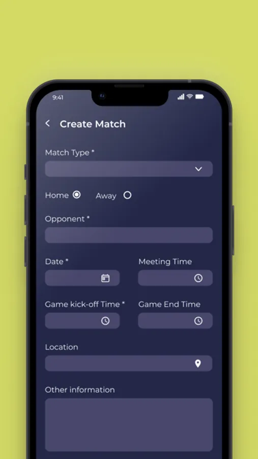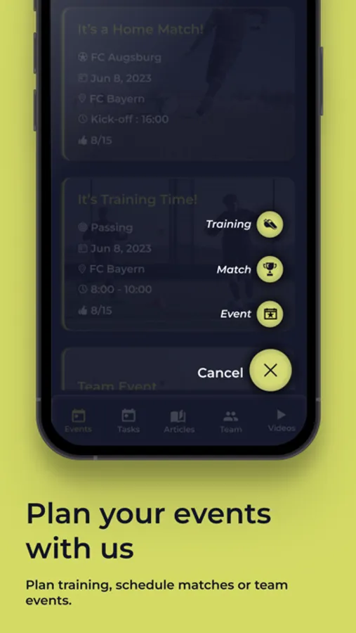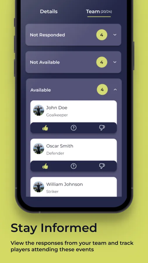 All dates, times, training locations, game days and any other event in one place. Players can easily confirm or deny presence or absence directly via the App.