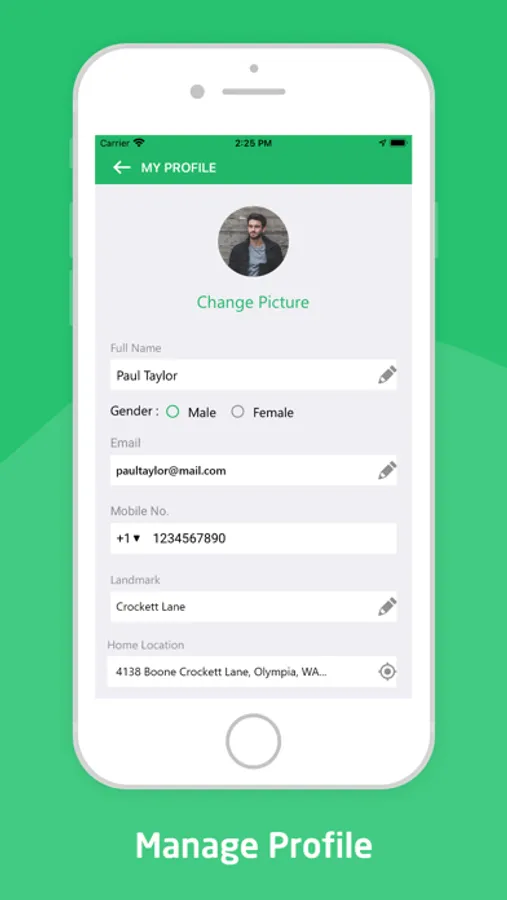 - Manage profile information like name, address, profile picture, delivery area, etc.