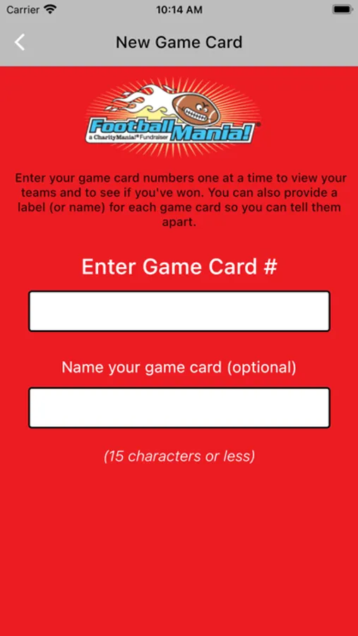 Important! You must already have a FootballMania game card to use this application. FootballMania game cards are not available through this app. To get a ticket, please contact one of the participating non-profit organizations that is using a FootballMania Fundraiser to raise money. Or visit www.CharityMania.com for ways to support local charities and get your FootballMania game card.