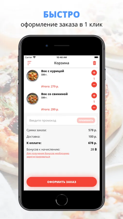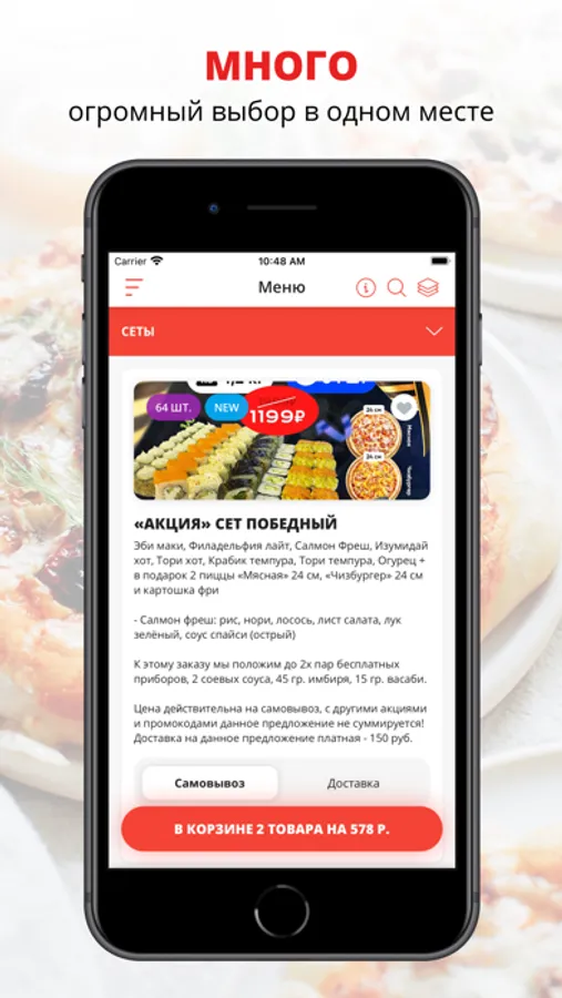 Скачивайте наше приложение, выбирайте желанные блюда из меню и заказывайте вкусную еду с доставкой!