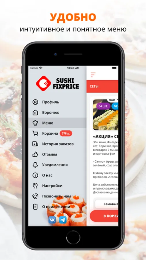 С приложением Sushi Fixprice доставка еды стала намного проще и удобнее! Заказывайте готовые блюда из нашего меню с доставкой на дом или в офис в один клик!