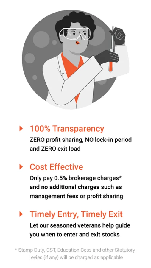 Reap the rewards of a professionally managed stock basket by only paying 0.5% brokerage (Stamp Duty, GST, Education Cess and other Statutory Levies, if any, will be charged as applicable) charges and no additional charges, such as management fees or profit sharing.