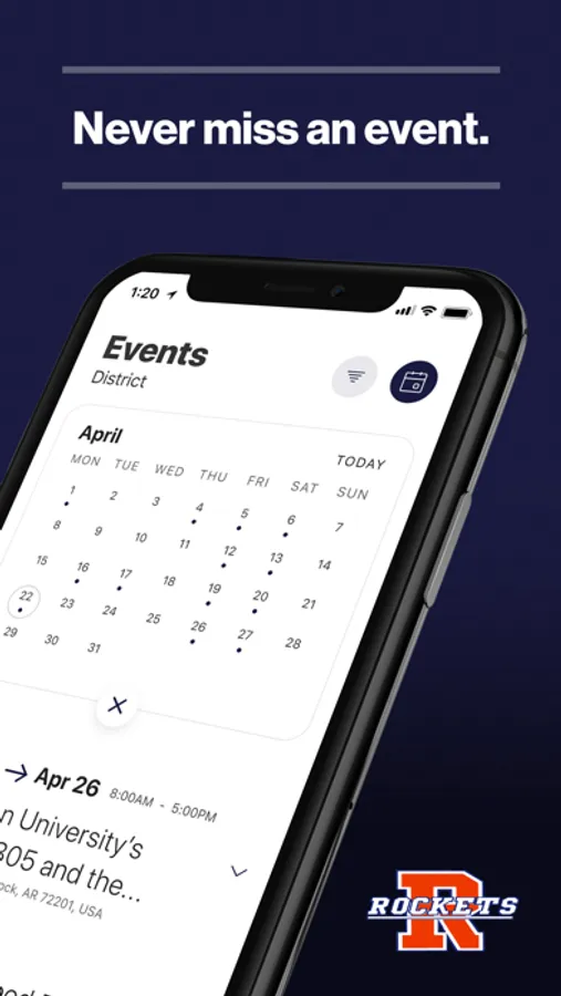 The event section shows a list of events throughout the district. Users can add an event to your calendar to share the event with friends and family with one tap.