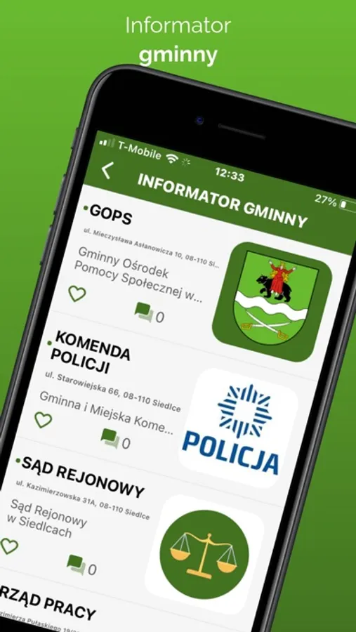 Używaj aplikacji !go Gmina Siedlce, aby poznać różne instytucje i komunikować się z nimi. Czytaj najnowsze wiadomości i komunikaty. Poznaj swój samorząd i komunikuj się z radnymi oraz władzami miasta. Pomagaj miastu rozwijać się - zgłaszaj usterki mienia oraz bierz udział w konsultacjach społecznych i badaniach opinii.