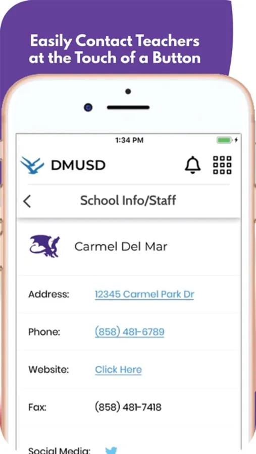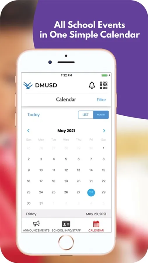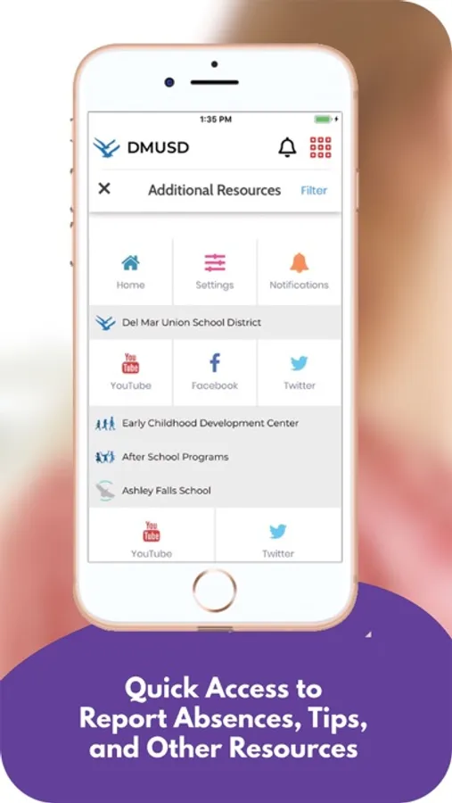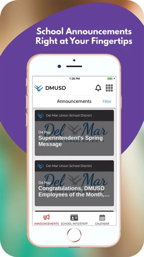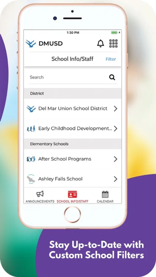 The app includes information for the district and all schools. Filter by the school your child attends to feature information for that school.