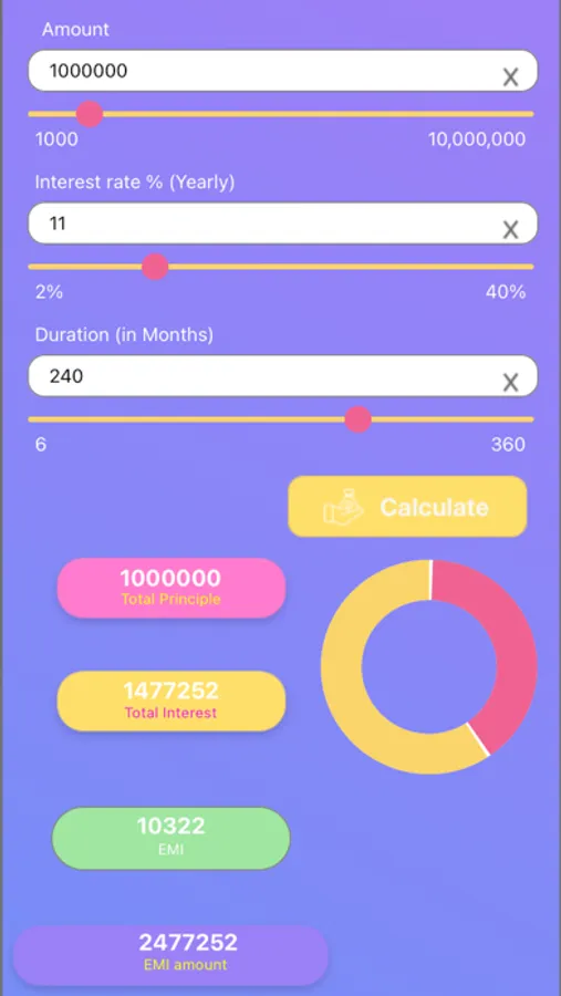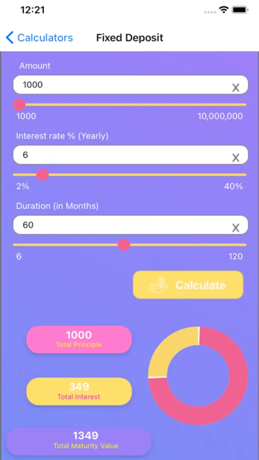 Always confusing to calculate fixed deposit, RD, EMI using a basic calculator. Now It's easy to calculate these complex calculation than ever before. Just enter the value and click calculate. you will get the values and a graph for the split.
