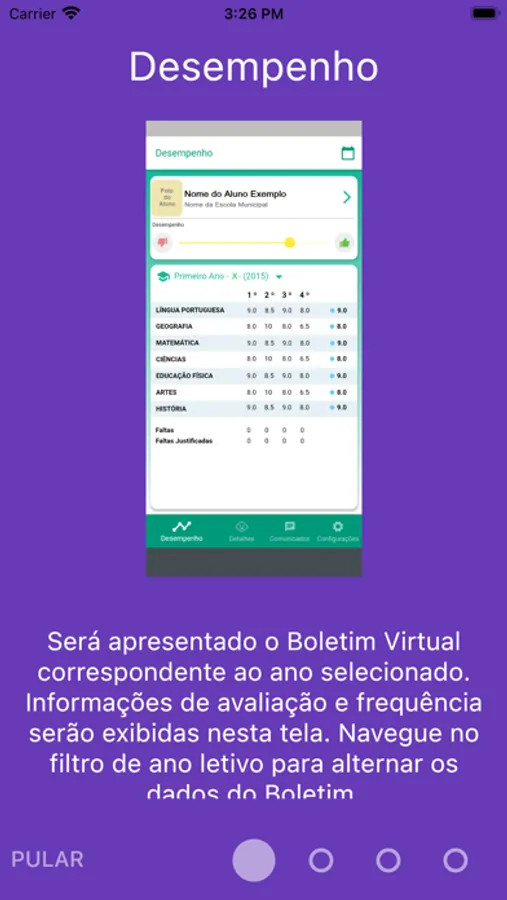 Um quadro com as avaliações dos alunos, sejam notas ou avaliações descritivas, divididas por bimestres, está presente no aplicativo, onde o pai do aluno poderá selecionar o ano que gostaria de visualizá-las, ou seja, é uma característica de "boletim virtual" de qualquer ano que o filho tenha cursado na rede municipal de ensino de Osasco.