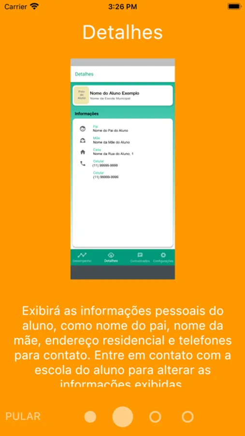 As informações pessoais do aluno, como nome do pai e nome da mãe, endereço do aluno, nome do aluno e telefone de contato serão visualizados.
