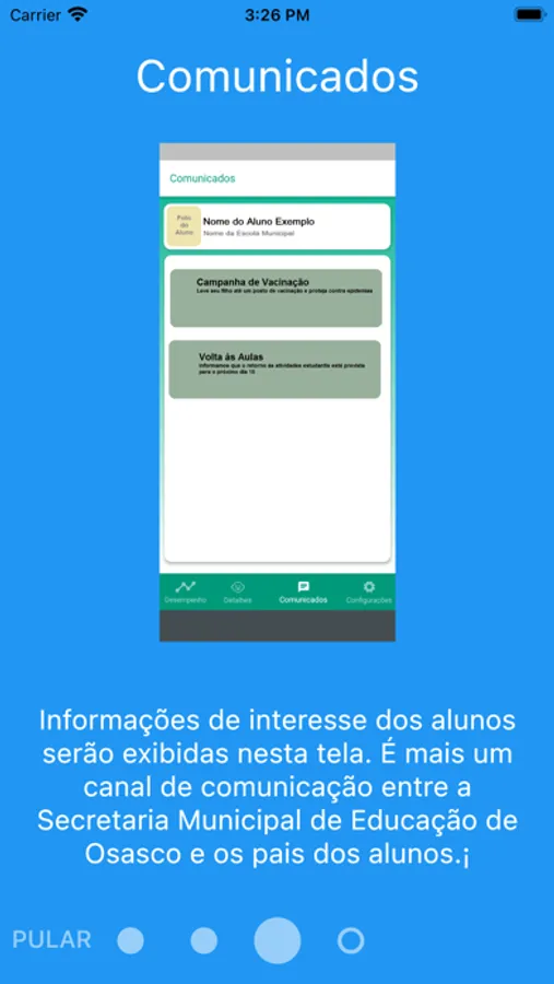 O aplicativo do aluno para acesso a dispositivos móveis, tem por finalidade exibir informações aos pais, dos filhos que frequentam a Educação Infantil e Ensino Fundamental da rede municipal de ensino de Osasco.