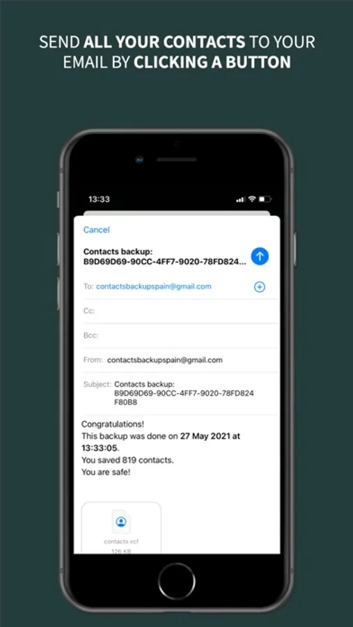 Send all your contacts to your private email with a single click. We do not collect any data and everything is stored in your email and device.