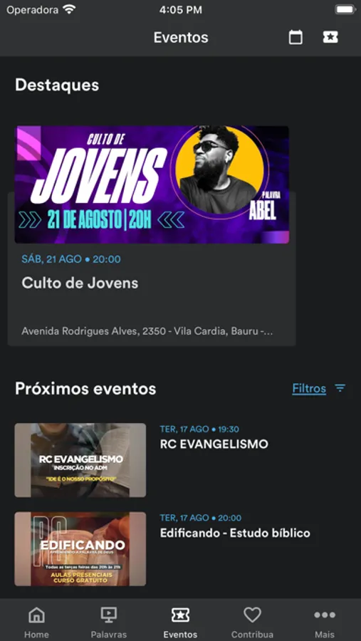 - Siga a agenda e fique por dentro de tudo que acontece na igreja, inscreva-se em eventos e tenha seus ingressos sempre com você.