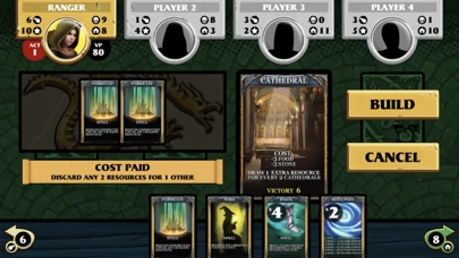 Legends of Draxia is a victory point, resource management, indirect competition fantasy game with a 35-45 minute play time. Players can adjust the difficulty by selecting Easy or Normal mode. There are multiple paths to victory. Whether you’d like to carve a path to glory by slaying monsters, gather resources to build cathedrals, or focus on casting powerful spells, there’s a character optimized for that. With so many characters and so many paths, a winning strategy in one match does not guarantee a victory in future playthroughs. Perfectly replayable!