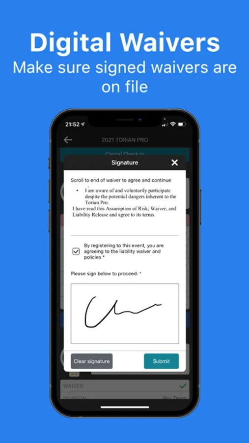 - Ensure every Athlete has a signed waiver on file, if not have them sign the waiver directly from your device.