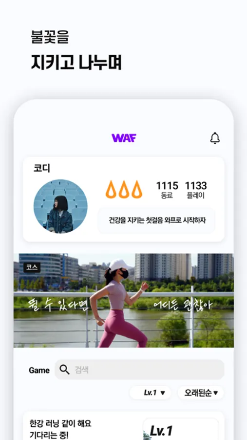 와프 세계에선 운동하지 않으면 하루에 한개씩 불꽃이 꺼져요. 불꽃을 끄지 않으려면 하루에 1일 1와프는 필수! 불꽃을 유지하다보면 어느새 건강해진 나를 발견할 거에요.