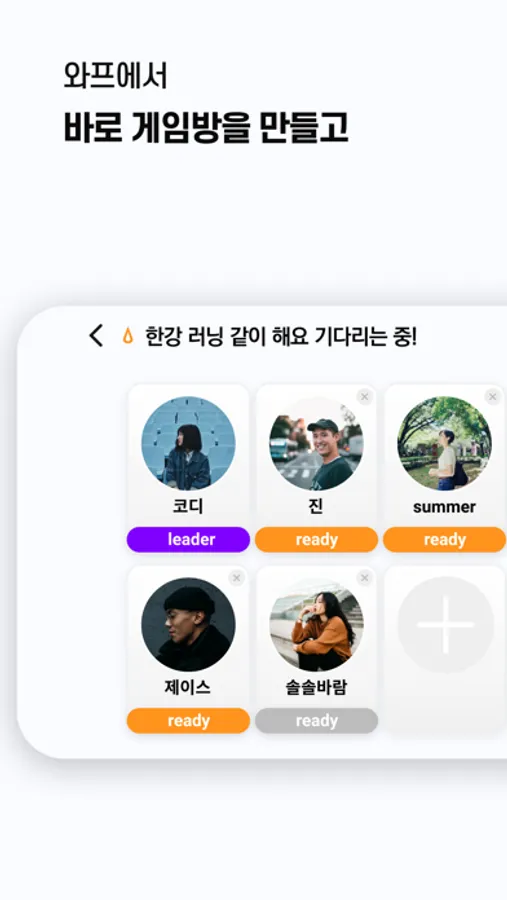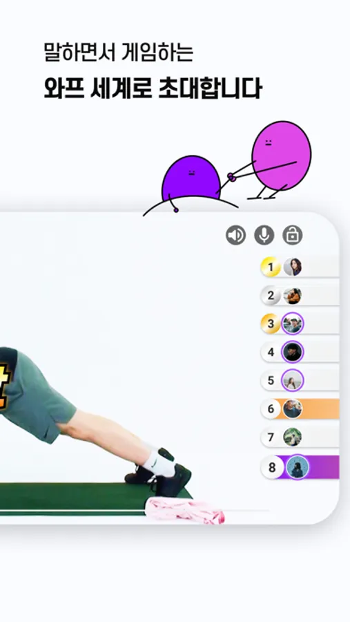 현실 세계의 동료들을 와프 세계로 초대해 함께 운동해요. 운동 맵을 선택하고 실시간 보이스 채팅이 가능하니 말하면서 게임을 즐기다보면 재밌고 신나게 운동을 즐길 수 있어요.