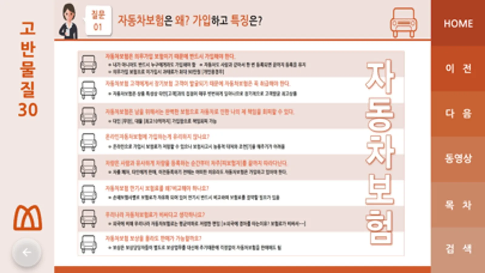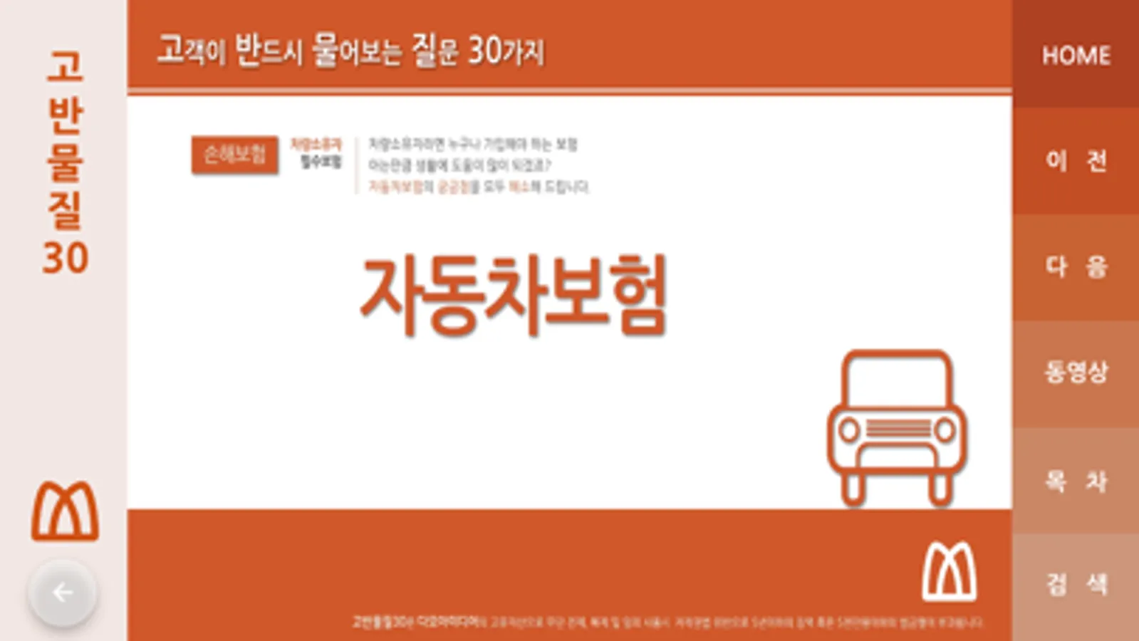 고객이 반드시 물어보는 30가지 질문에 관한 교육 동영상으로 슬라이드, 동영상, 검색, 등 보험영업활동시 자세하고 세부적인 설명으로 큰 도움을 받을 수 있도록 제작하였습니다.
