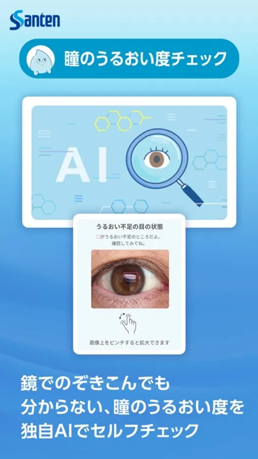 瞳うるるスキャンは、鏡でのぞきこんでも分からない瞳のうるおい度(涙の状態)を独自のAIが解析して、あなたの状態にあったケアを教えてくれます。「乾き」「疲れ」を感じられているあなた、日々の状態をチェックして、うるるん瞳を目指しましょう!