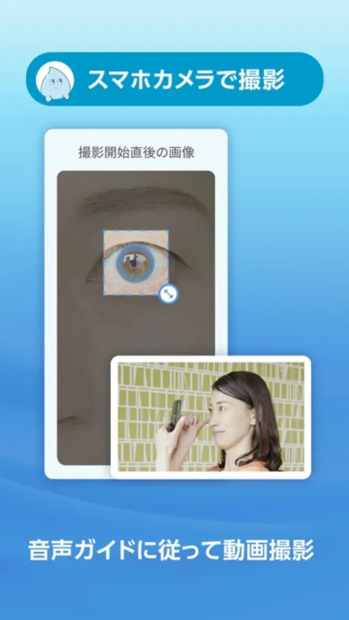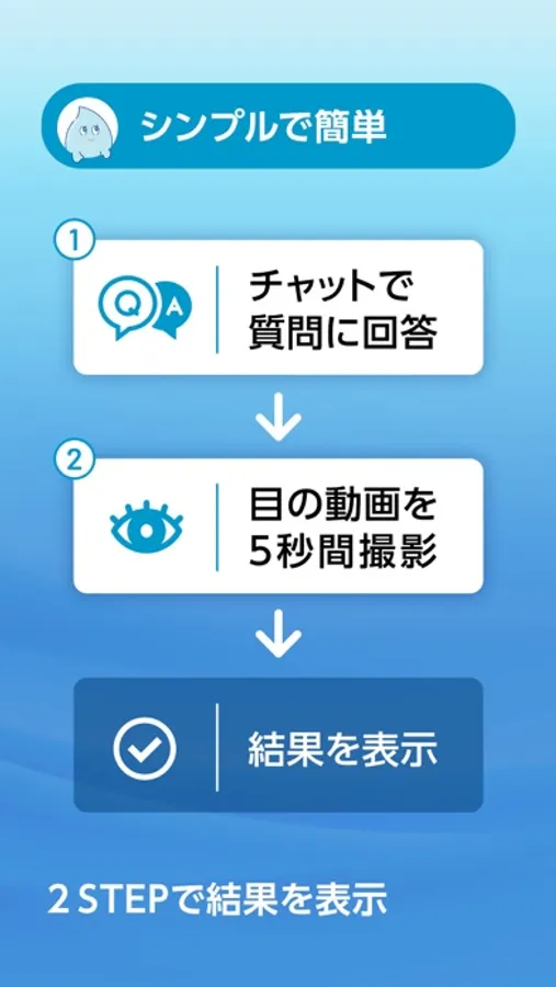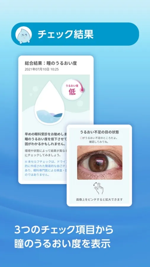 チャット形式でいくつかの質問に回答し、音声ガイドにしたがって目の動画を5秒間撮影することで、AI画像解析により評価されます。総合結果は、瞳のうるおい度:高、中、低で表示され、それぞれの結果の解説もご覧いただけます。