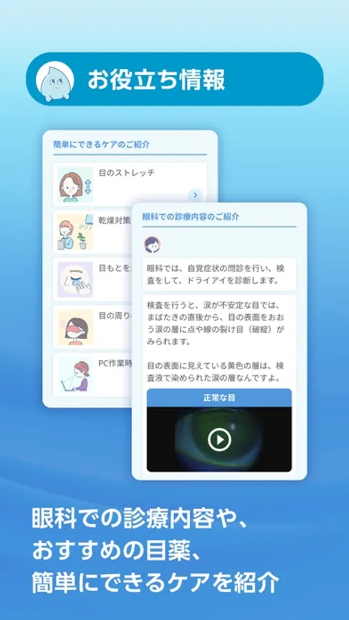 最寄りの眼科検索サイトといった、外部サイトへのリンクによる情報提供も行っています。色々な知識を得て、瞳のうるおい度アップのためにケアを始めましょう。
