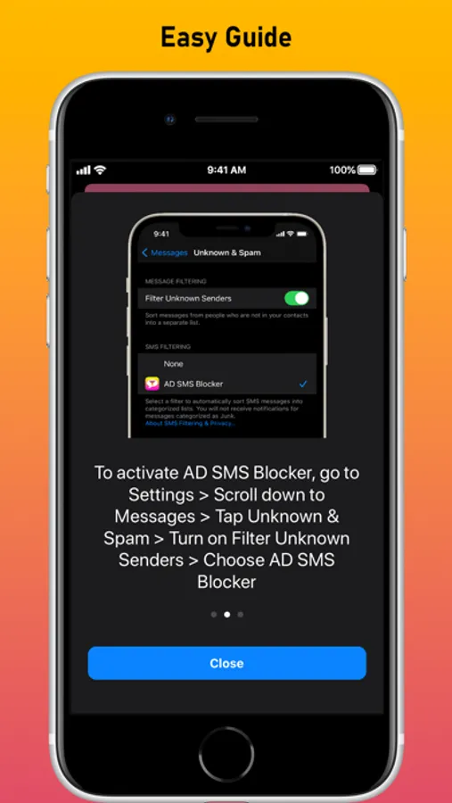 PLEASE FOLLOW THE INSTRUCTIONS TO TURN ON AD SMS BLOCKER. It will take few seconds to set up the application.