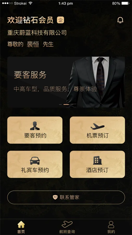 主要功能:主要功能包括首页、登录、账号分配、预约服务、联系管家、礼宾车预约、酒店预订、机票预定、航班动态查询、个人中心、后服务安排、预约处理等功能。