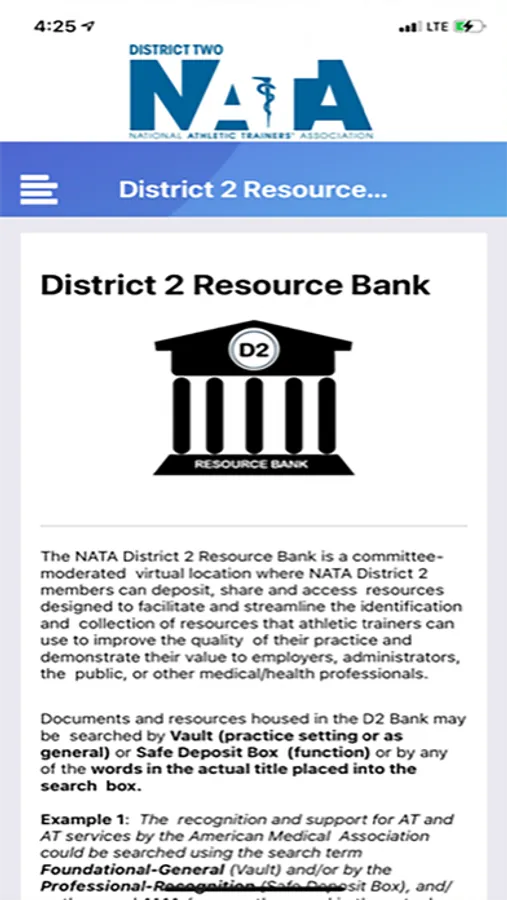 The purpose of this app is to be a resource tool for members of the National Athletic Trainers' Association who reside in District 2. It contains a calendar of events, a link to the member Resource Bank, leadership listings and more. It is also a quick and easy way to keep up with the latest news from the District and communicate with the District 2 Director