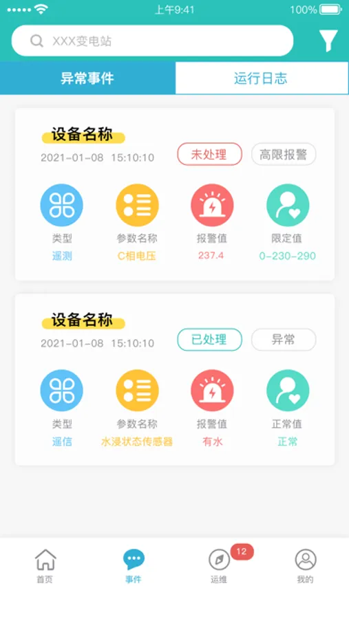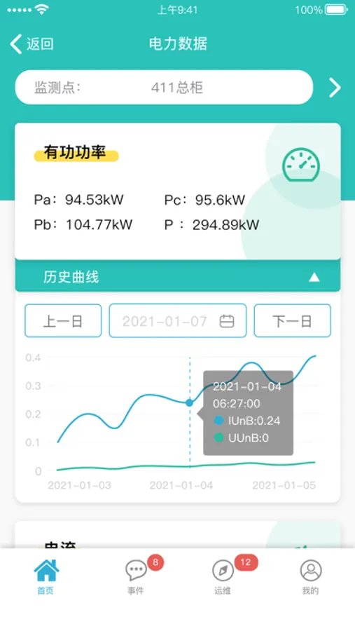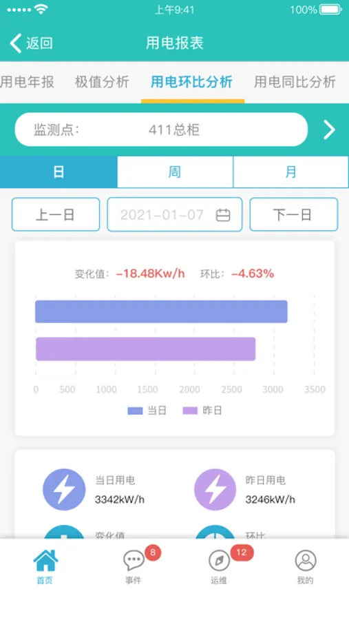 电力运维平台App包含主页,事件,运维,我的,共四个主题页面。主要是对变电站的基础信息查看。主要包含用电量,功率,用电环比同比,报表等一些信息。运维包含对变电站的基础维保巡查的安全维护。我的页面是用户的基础信息。