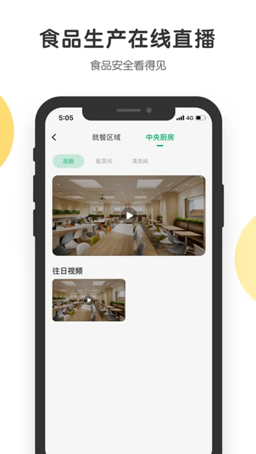 3、家长可以通过开心虎APP看到中央厨房生产加工情况,孩子就餐场景,真正做到看得见才安全。