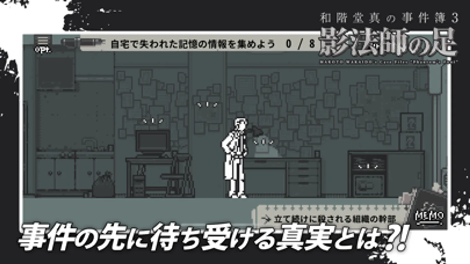 取得した情報はMEMOからセットを行い、対象者や対象物に話しかけることで新たな選択肢が表示され、さらに新しい情報を取得できます。