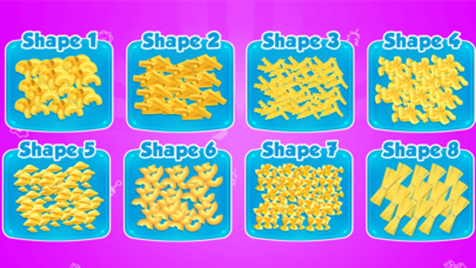 • Tons of pasta shapes for you in chef games