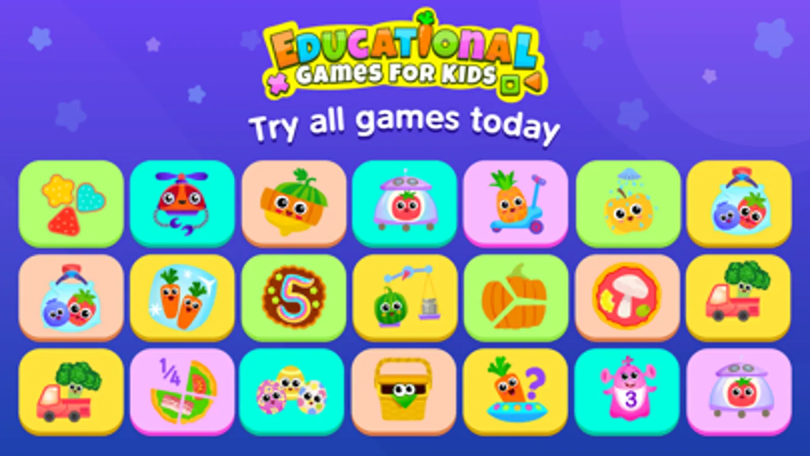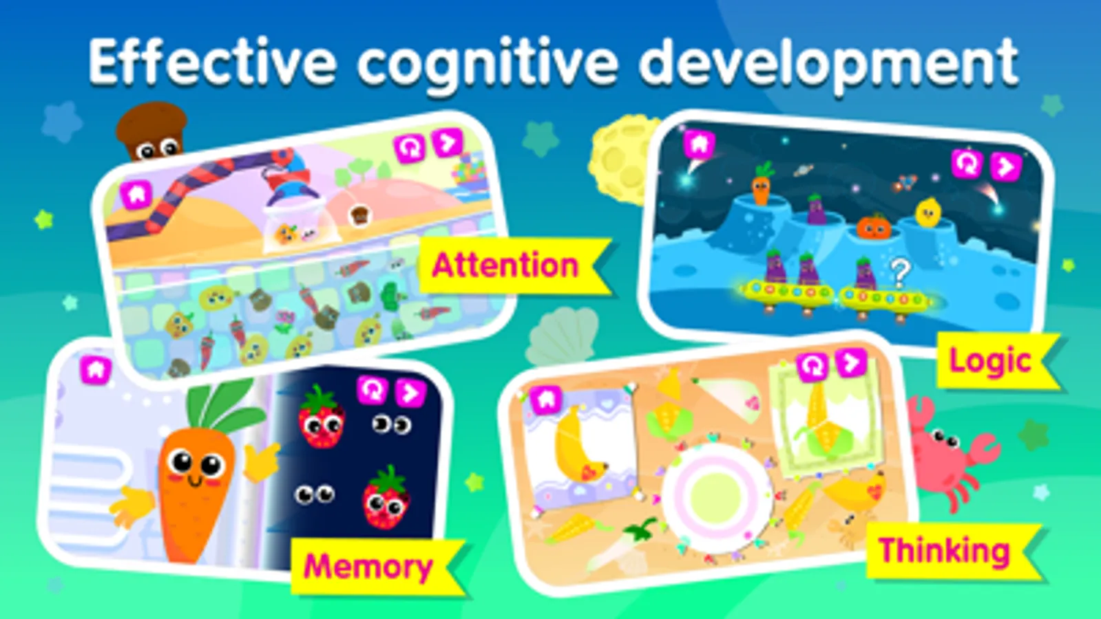 Our educational games for kids were created to help toddlers master basic math and logic before they even go to kindergarten. Fruit and veggies help kids play number games for children to get them to understand such concepts as bigger and smaller, learn numbers from 1 to 9, and stimulate cognitive development.