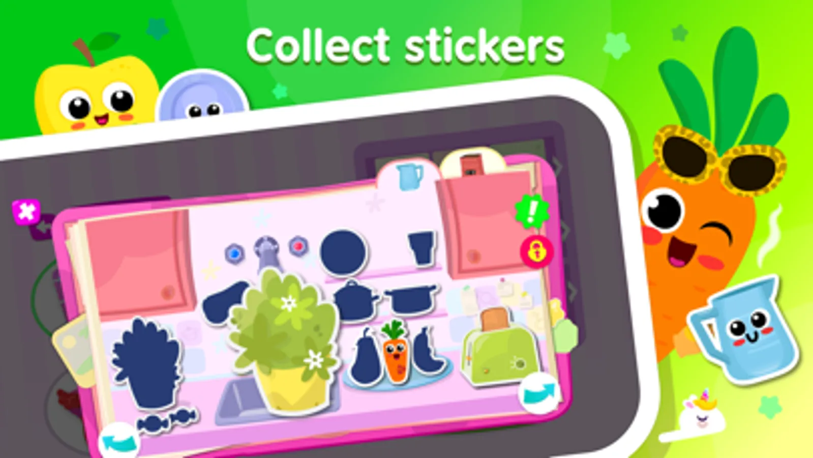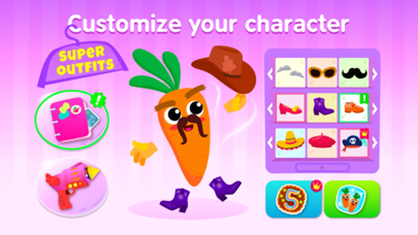 Carrot, the app’s adorable assistant, is also there to facilitate kids’ introduction to mathematics. Inviting children to play, Carrot encourages them and provides motivation on the go. And, with the collectible sticker albums, the more little players play and learn, the more stickers they earn and the more funny outfits they get to dress Carrot in.