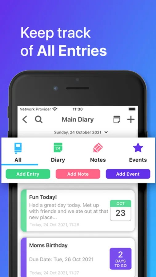 - Attach Pictures, Files and Photos to each diary entry - with the tap of a button.