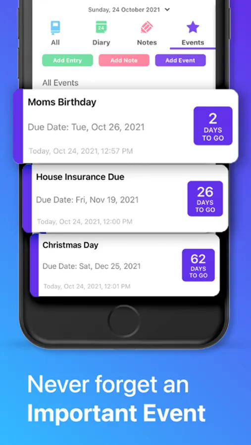 - Create Event entries for birthdays and anniversaries, set to run just once or every day, week, month or year. Never forget an important event again.