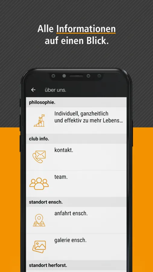 Suche nicht lange nach wichtigen Infos wie Öffnungszeiten und Kontaktdaten mehr. Dank der App genügt ein Klick auf das Smartphone, um Dir im Nu die gewünschten Informationen zu liefern. Stöbere zusätzlich in tollen Rezepten, entspannt in aktuellen Studiofotos – ob zu Hause auf der Couch oder gerade am Bahnhof. Hilfreiche Trainingstipps runden Deine mobile Infoplattform ab. Der Clou: Alle Meldungen kannst Du sofort per WhatsApp oder Mail mit Freunden und Bekannten teilen.
