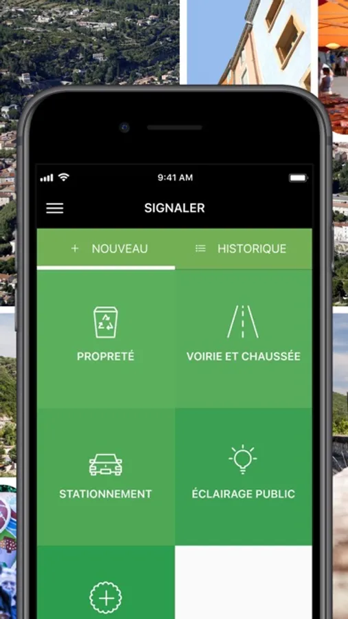 - Signalez instantanément les incidents que vous pouvez rencontrer : chaussée endommagée, éclairage public, déchets…