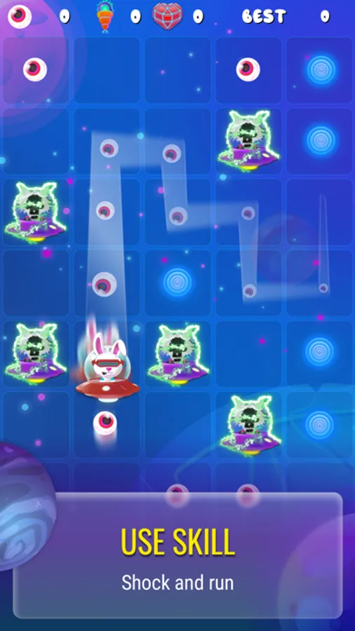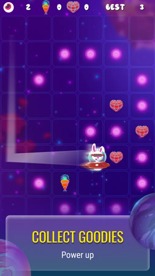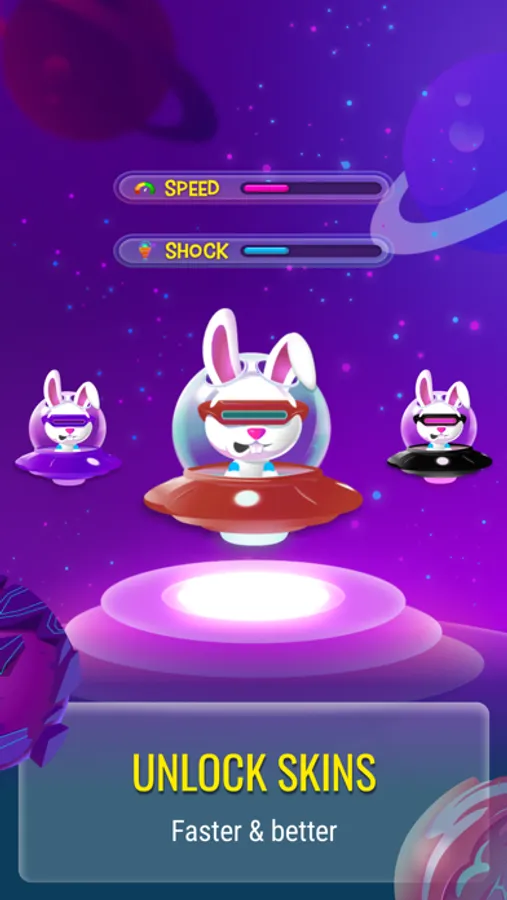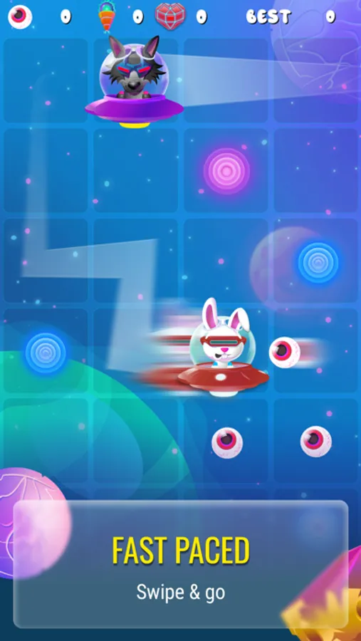 The gameplay is unique having simple yet powerful set of controls. Play however you want - use swipe for quick steps, swipe and hold to go further more easily but sacrifice your speed or draw out a path starting from the rabbit, when you let go the rabbit will follow. The wolves follow you wherever you go, pay attention to their spaceship in order to get hints of their movement. In tricky situations get away from them by teleporting through the portals, or by using your double tap skill to slow them down. Teleport to carefully crafted bonus levels and collect skill items and additional lives. You will need to navigate through meticulously placed obstacles while controlling the rabbit with completely new and difficult gameplay mechanic. Play as much as your skills allow - the game doesn’t have an end, but it gets incredibly hard as you progress. Fast fingers and even faster thinking are your best friends.